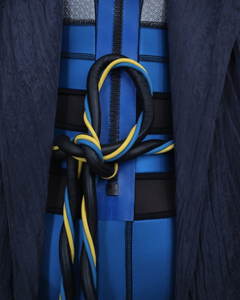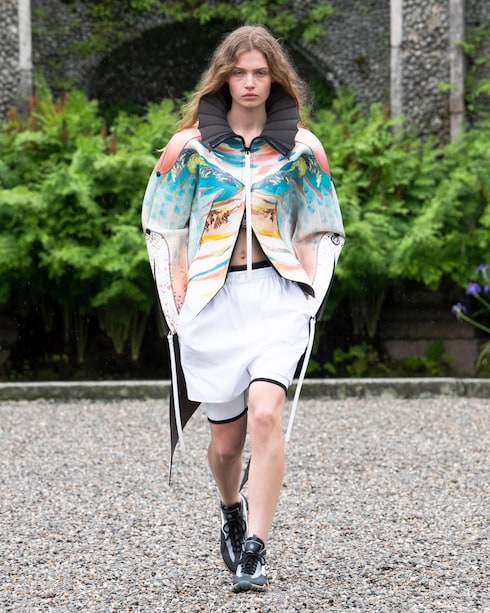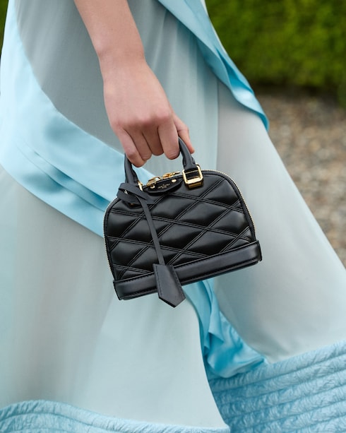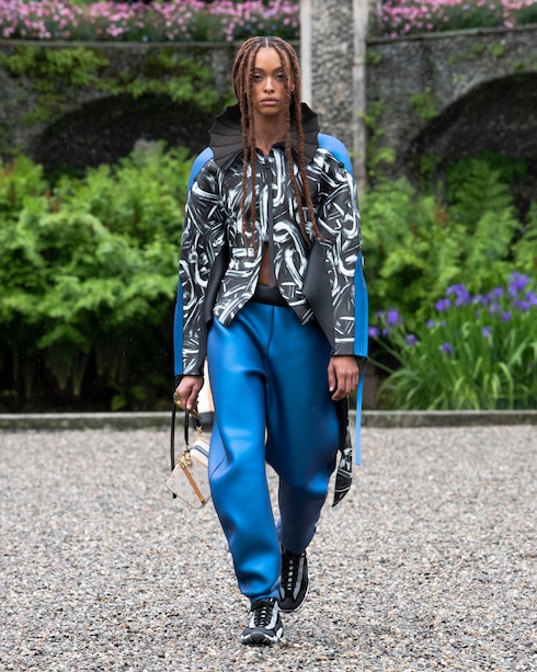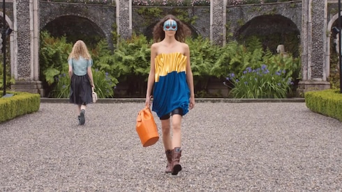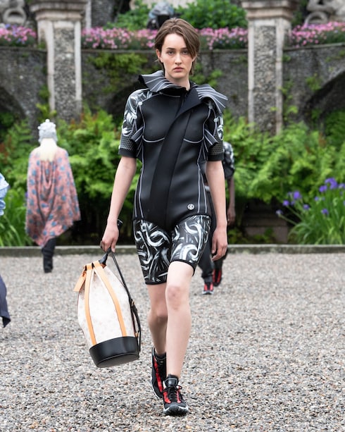 Reflecting the progression from nautical to botanical, the silhouettes are adorned with silks and sequined embroidery, emulating scales and the movement of water. On dry land, prints flourish and lines become sculptural, while bags mark a post-modern tale, enveloped in the new Monogram Dune or in colorful variations of Épi leather.