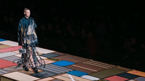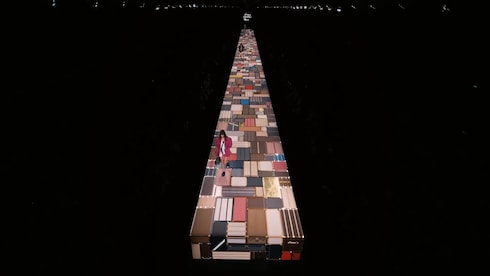 A rigid platform made up of over a thousand different trunks, the central runway of Nicolas Ghesquière's show pays homage to the history of the Maison, standing at the forefront of an immersive mirrored structure — reflecting the majestic architecture of the Cour Carrée du Louvre in Paris.