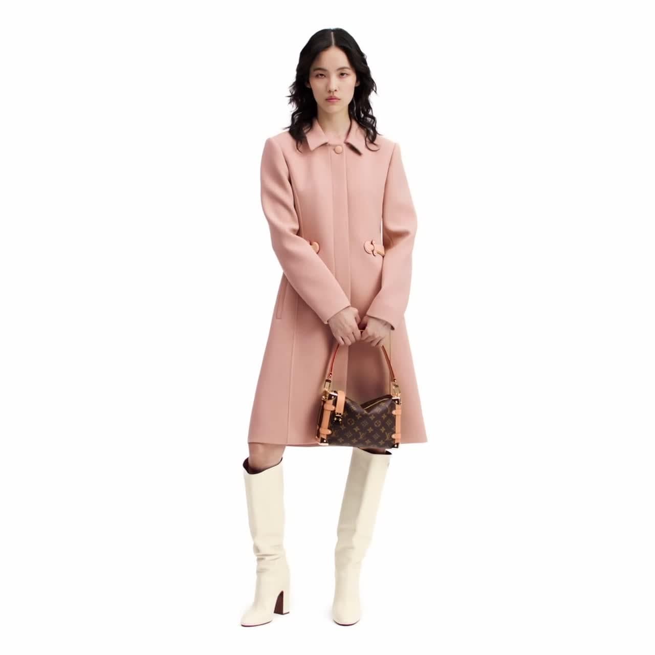 This coat projects timeless elegance in plush double wool crepe tailored in a fitted knee-length shape. Tone-on-tone leather belt details highlight the tapered waistline, while princess seams flatter the figure. Complete with a smart flat collar and a covered button fastening for a clean finish. Lined with Monogram silk.