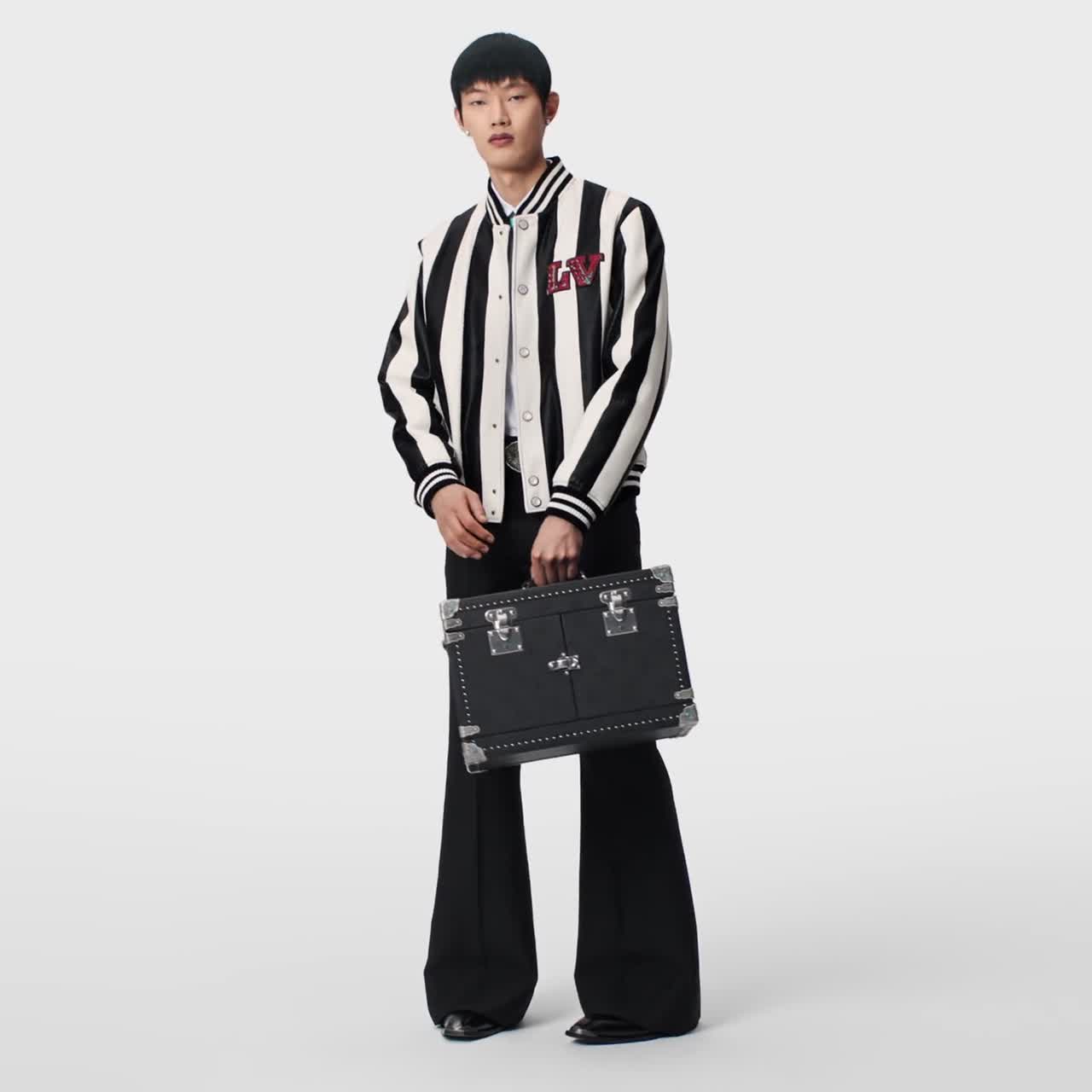 This iconic bomber from the FW24 Show runway showcases the House’s savoir-faire, with graphic black and white vertical stripes crafted from python skin assembled with a meticulous intarsia technique. Embroidered signature patches on the chest and back draw on the collection’s vintage Far West aesthetic, while pearl-effect snap buttons add an elegant dandy twist.