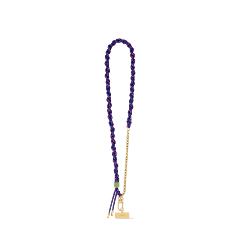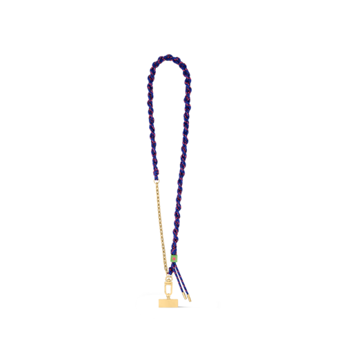 The sporty-chic Braided phone strap combines on-trend elegance with practical utility. A colorful braided textile cord is paired with a gold-toned chain and a Louis Vuitton Paris tether tab. Long enough to wear cross-body, this versatile strap is perfect for keeping a phone close at hand while adding a stylish accent to any look.