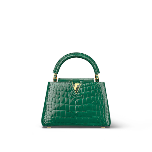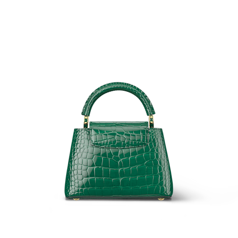 This Capucines Mini is crafted of precious crocodilian leather. Lined with luxurious goatskin and fitted with gleaming metal hardware, it features the distinctive Capucines flap, which can be tucked in to display the LV signature, or worn outside to reveal a Monogram Flower. Its petite dimensions make this exceptional piece a splendid choice for evening