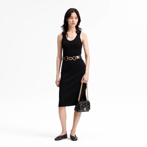Statement detailing elevates this understated dress with edge. It is cut from a lightweight viscose-blend crepe jersey in a sleek tank silhouette that falls to the knee. The waistline is highlighted with a chunky leather belt detailed with golden studs and an oversized carabiner clip for a modern twist.