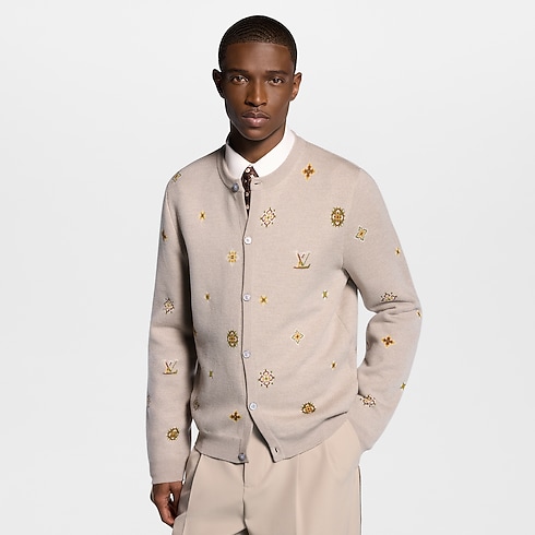 This collarless beige cardigan brings a soft signature accent to spring looks. It is adorned with a jacquard LV Flowers motif in delicate tones, with Monogram-inspired blossoms interspersed with LV signatures, while pearly buttons add a Dandy accent. This light wool-cotton knit adds a distinguished twist to this collection’s subtle hues, layering effortless elegance into an ensemble.
