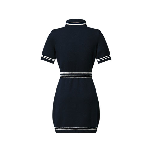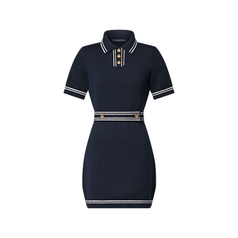 This knit dress has chic appeal in a trompe l’oeil silhouette defined with contrasting stripes around the short sleeves, waist, polo collar and hemline. It is spun from a comfortable wool-cashmere blend featuring a subtle Monogram motif in delicate openwork. Domed golden anchor buttons add a polished finishing touch to the neckline and integrated belt detail.