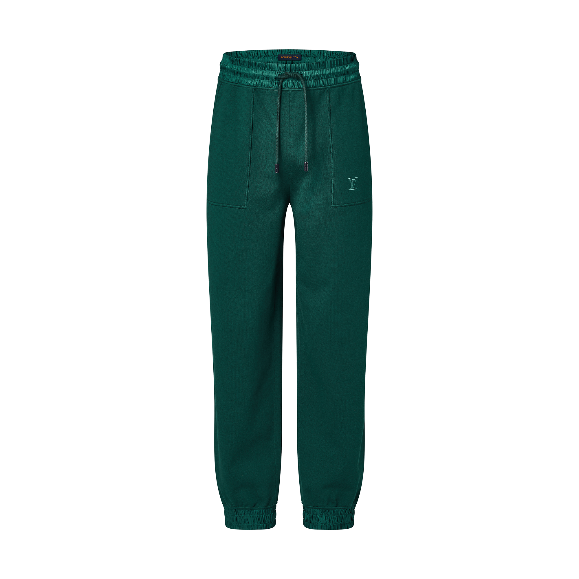 These jogging pants in a compact cotton knit are given a distinctive twist with their elasticated drawstring waist and cuffs, which are embellished with a shiny technical fabric featuring the Monogram motif. A thick cordon drawstring makes them fully adjustable. An embroidered LV signature on the front left patch pocket adds a smart finishing touch.