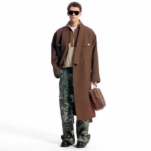 This hybrid pullover with a half-zip collar draws on sporty references with a beige Damier cotton piqué body adorned with color-blocked nylon inserts in rich brown tones. An LV Japan signature label is embroidered on the kangaroo pocket, in a nod to this season’s collaboration with Japanese designer Nigo. Matching shorts make a relaxed yet distinguished set.
