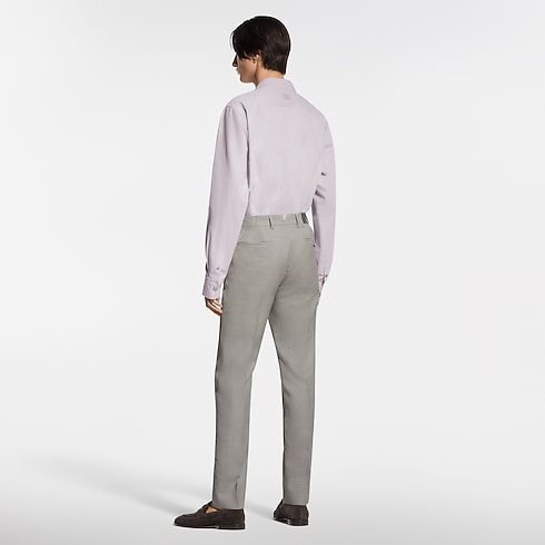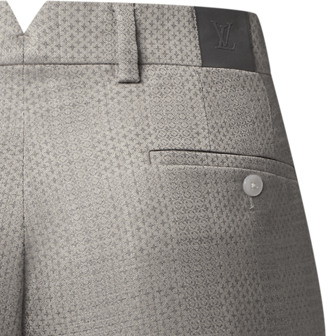 These pale beige cigarette pants are tailored from fine virgin wool featuring a delicate tone-on-tone jacquard Micro Flower Damier motif and signed with a woven LV label on the back. Their slender silhouette can be paired with a matching Napolitana jacket to create an elegant modern suit for business occasions, elegant summer evenings, or weddings.