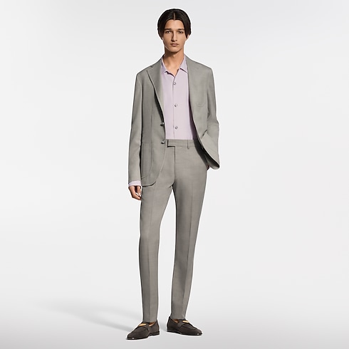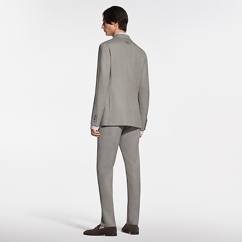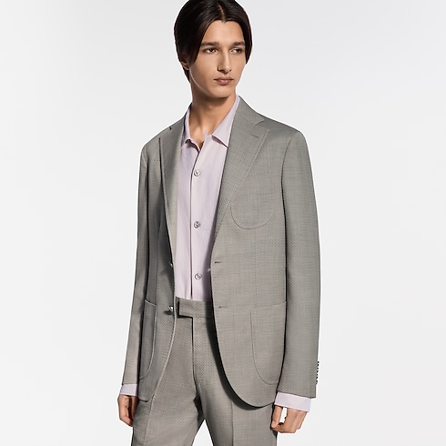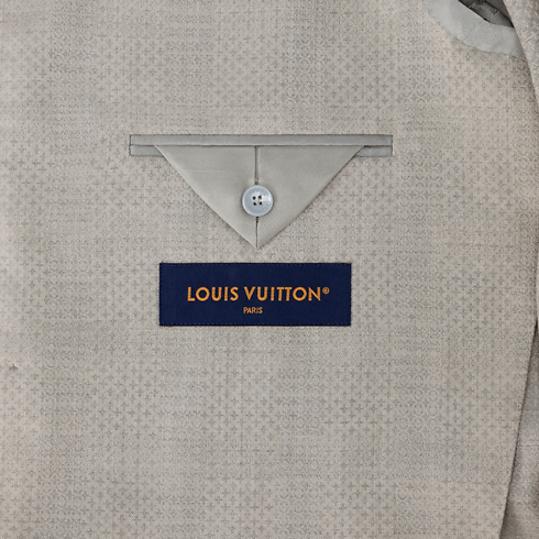 This pale beige single-breasted Napolitana jacket is cut from fine virgin wool featuring a delicate tone-on-tone jacquard Micro Flower Damier motif and pearly signature buttons. The soft, Italian-inspired tailoring creates an effortlessly elegant silhouette. Paired with slender cigarette pants, it makes a refined and modern suit that can be styled for business occasions, elegant summer evenings or weddings.