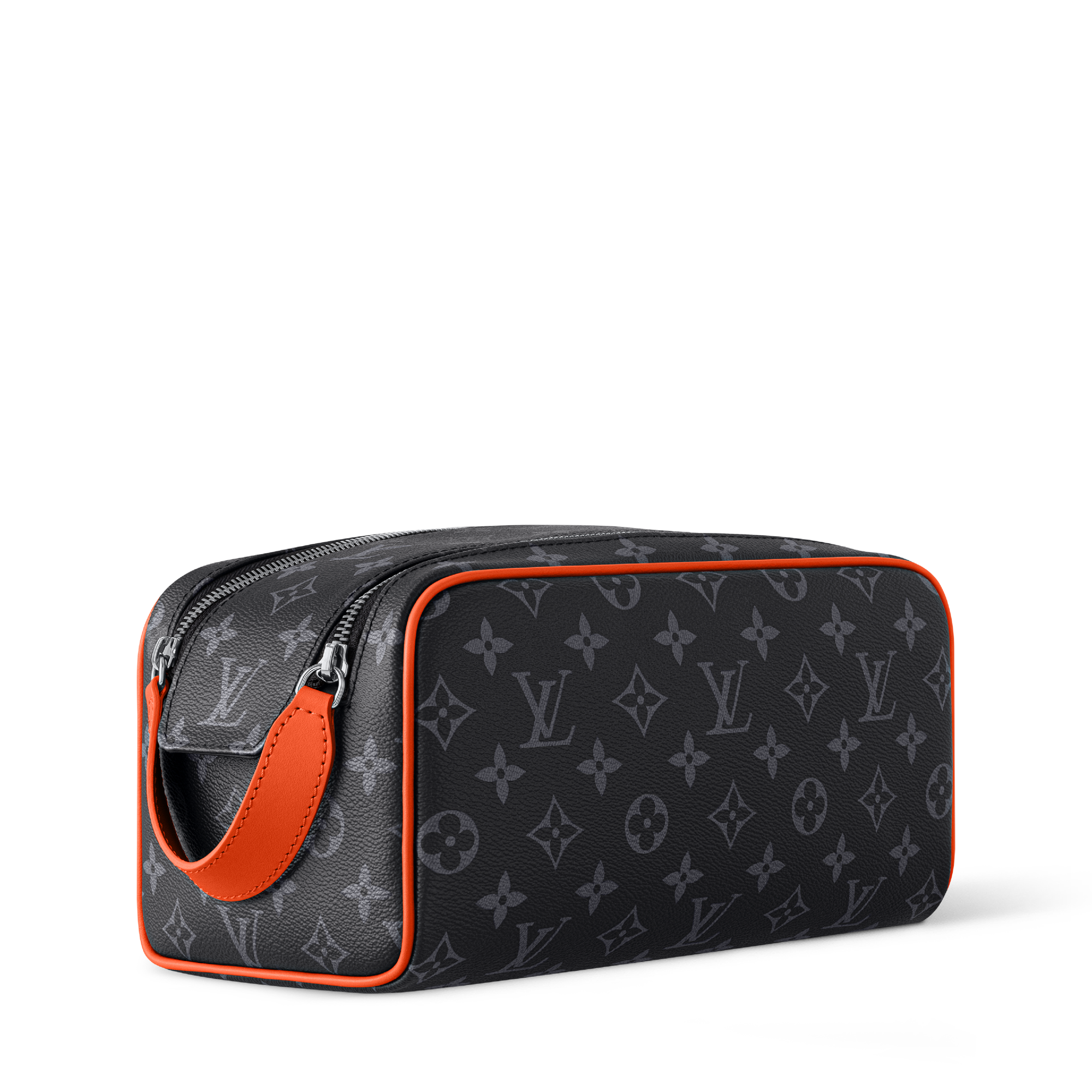This Dopp Kit is crafted from Monogram Eclipse coated canvas, accented with a touch of color on the piping and handle. Designed to carry and store grooming essentials, it features a wide, double-zippered opening for easy access to its contents. The black textile lining is washable, ensuring effortless maintenance.