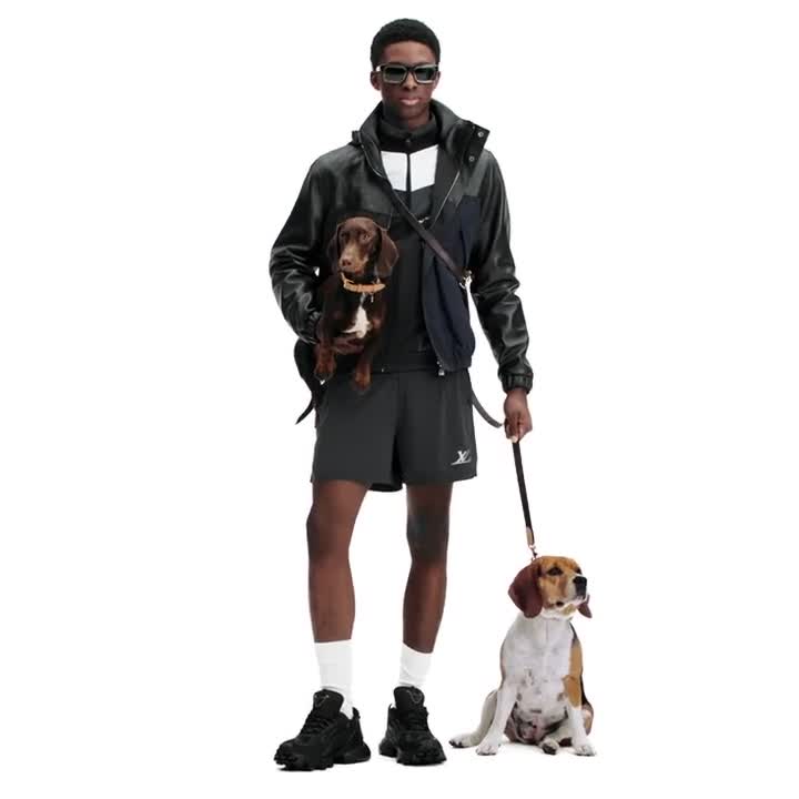 These black double-layer running shorts blend fashion and functionality, combining a traditional running short aesthetic with a supportive inner layer. The fast-drying, soft and breathable technical fabric offers 4-way stretch for comfort. Louis Vuitton lettering adorns the elasticated waistband while a reflective LV signs the left leg. A T-shirt and track top make a coordinated set.