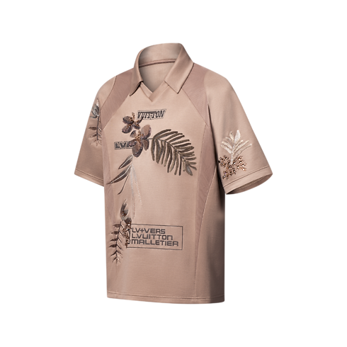 This dark brown v-neck t-shirt inspired by the Spring-Summer 2025 show’s soccer theme elevates a sporty silhouette with Louis Vuitton savoir-faire. Crafted from technical cotton jersey with mesh inserts, it is adorned with printed tone-on-tone signatures, while rhinestone crystals and gleaming beaded floral embroidery adorn the front and sleeves. Matching shorts make a casual yet sophisticated set.