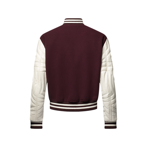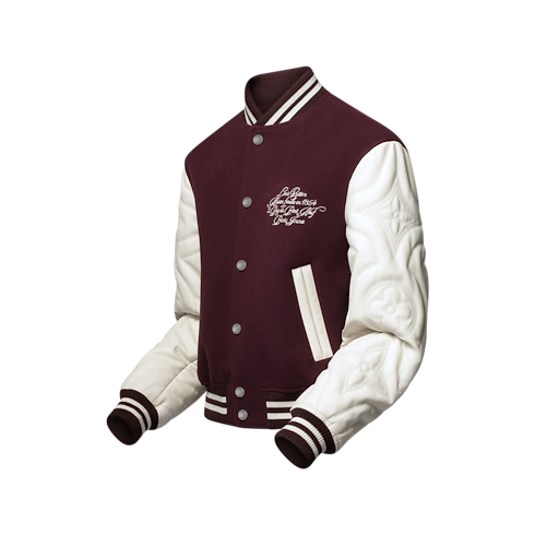 The iconic varsity jacket is revisited with sophisticated calfskin sleeves that are meticulously quilted with a 3D effect incorporating Monogram signatures. Pearl-effect buttons add a chic accent to the claret-toned wool body, which is adorned with a delicately embroidered cursive House signature on the chest. This elegant, preppy design elevates any look.