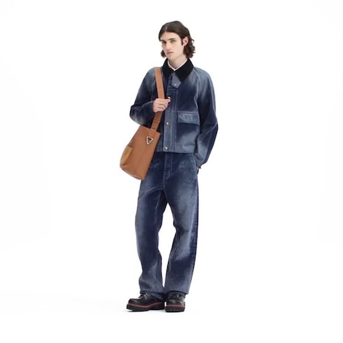 This dark blue trucker jacket is meticulously crafted from velvety flocked denim which has been overdyed and given a wax treatment for a rich vintage patina. It has a corduroy collar inspired by British outdoor tailoring and two utilitarian flap pockets signed with a stamped Monogram motif. Pair with matching pants for a rugged twist on an urban silhouette.