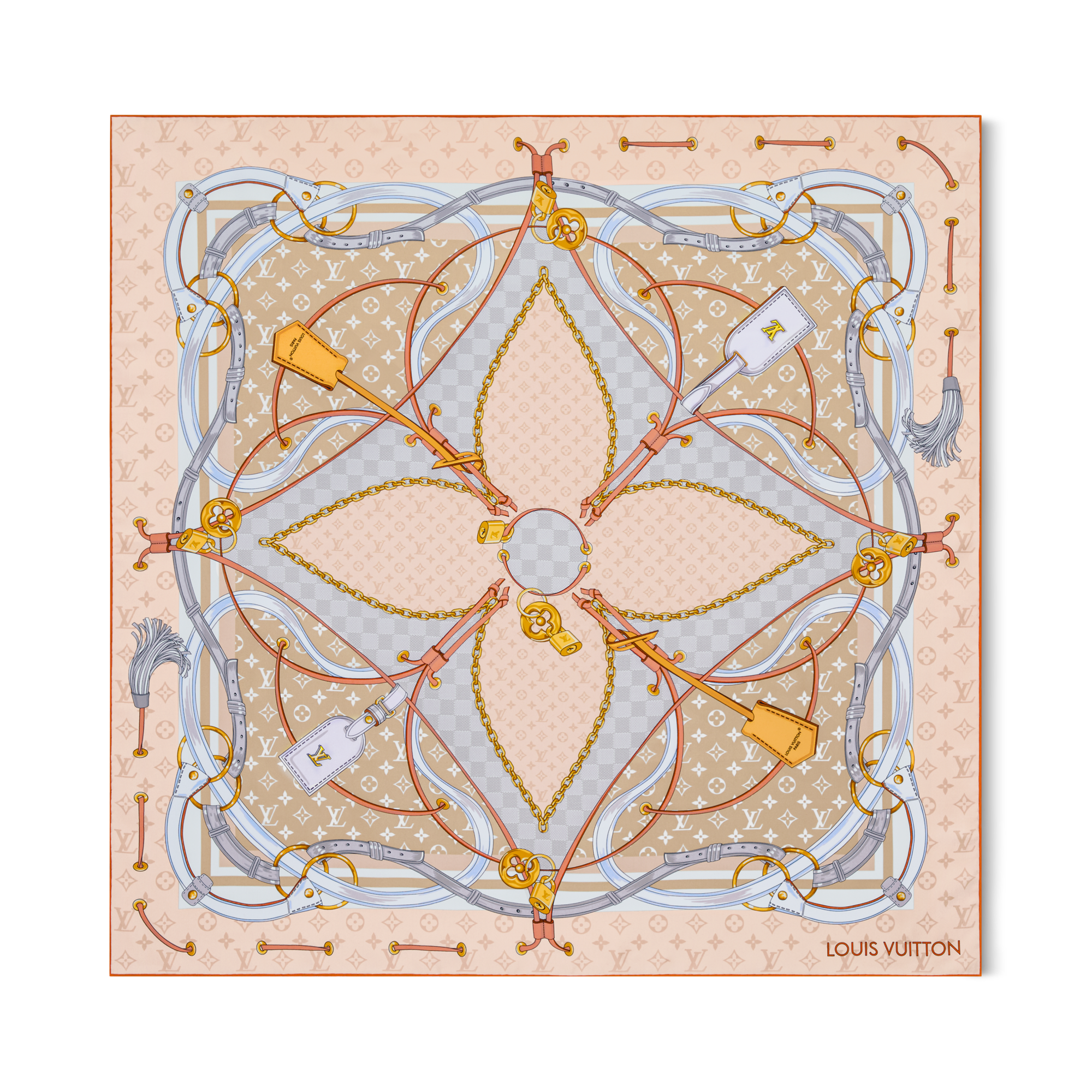 The elegant new Flower And Straps square makes a bold but refined signature statement. Screen-printed on sumptuous silk, its fresh modern design is an upbeat composition of beloved Louis Vuitton icons, featuring a Monogram Flower plus straps, padlocks and luggage tags. The background incorporates the Monogram and Damier patterns for an additional House touch.