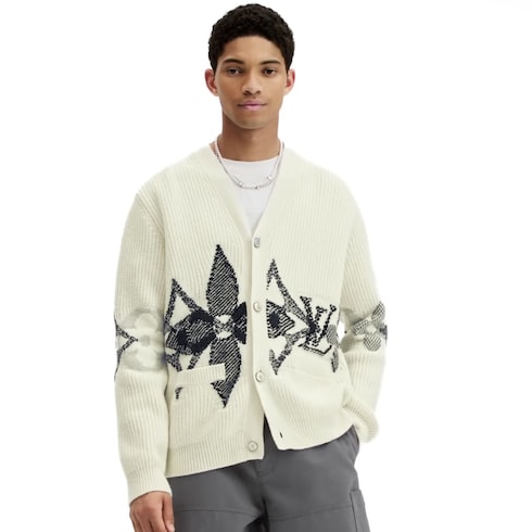 This wintery wool cardigan features a graphic signature motif, with macro overlapping LV and Monogram Flower signatures recalling snowflakes across the lower torso and sleeves. The sophisticated intarsia knit uses contrasting stitches in gray and blue tones against the chunky ribbed white base, resulting in a richly textured effect. Ideal for cozy resort evenings after a day on the ski slopes.