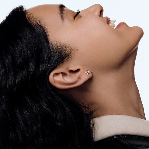 Finely crafted in lustrous pink gold enlivened with nine resplendent diamonds, the Idylle Blossom stud earring pays homage to a historic House icon. Their artistic design creates a striking visual harmony between the star-shaped Monogram Flower and the circle, a timeless symbol of infinity. On-trend and elegant worn alone, they combine easily with other jewels, brightening the face with an aura of radiant refinement.