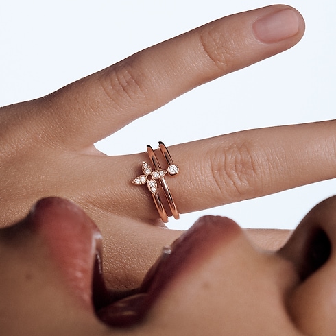 The Idylle Blossom Multi ring combines an instantly identifiable Louis Vuitton icon with a creative spiral design. Styled in pink gold accented with nine radiant diamonds, it harmonizes a star-shaped Monogram Flower with a finely crafted circle, a symbol of perpetual movement and infinity. Fresh and feminine, this exceptional ring adds a delicate touch of refinement to an everyday or evening look.