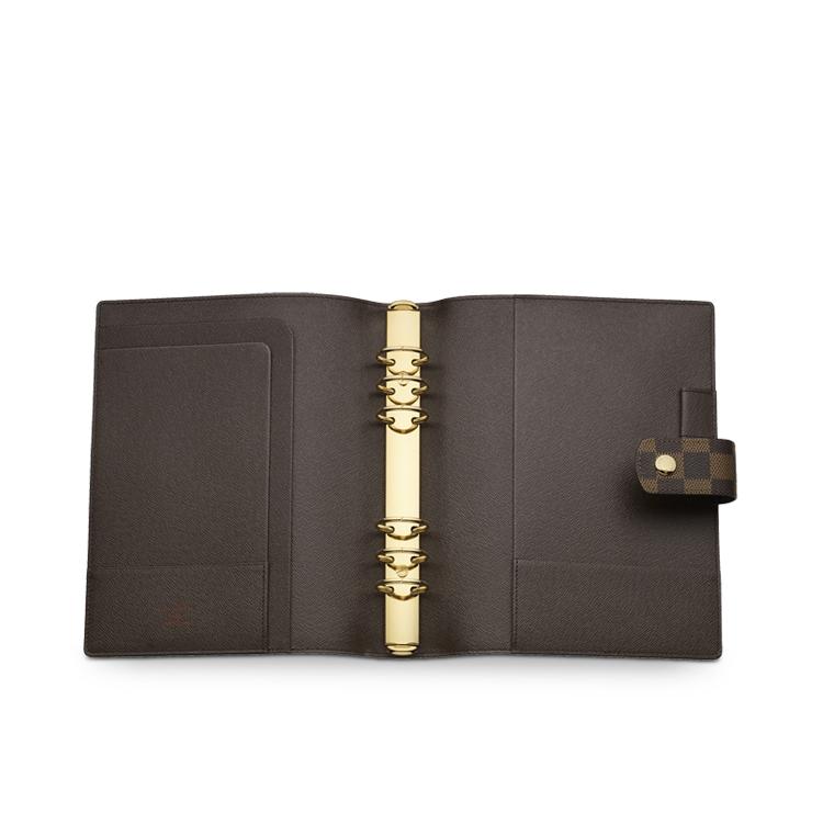 - Six-ring binder, separated into two groups of three, credit card slots, several compartments