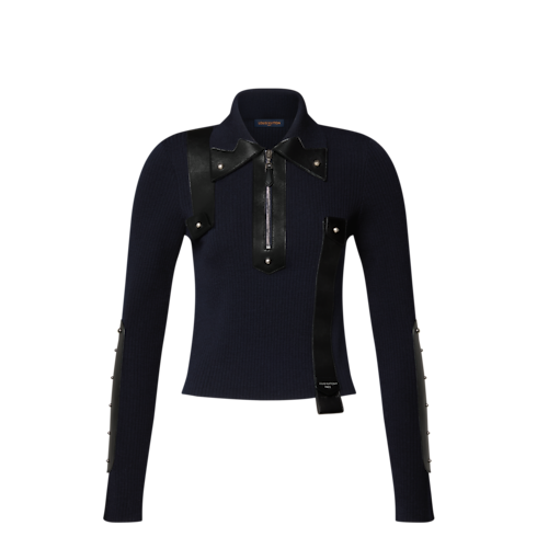 Rebellious details subvert the preppy codes of this polo top. Spun from ribbed-knit wool in a form-fitting shape, sleek leather accents detailed with silver-toned hardware add a graphic touch to the collar, front zipper and sleeves, complete with two coordinating lambskin strap embellishments on the body.