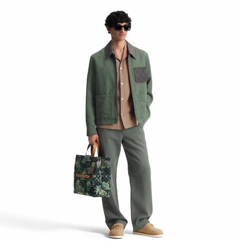 This workwear-inspired zippered jacket in a light linen twill is an effortless piece for completing summery everyday looks. The chest is adorned with a debossed Damier leather patch pocket, while a nubuck Marque L.Vuitton Déposée label signs the back. Available in a versatile dark green, it can be worn as a set with matching pants.