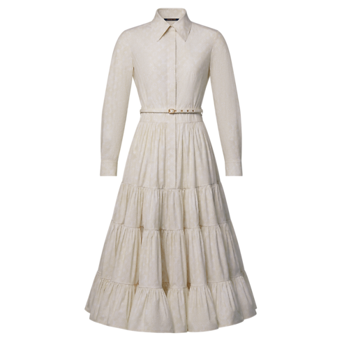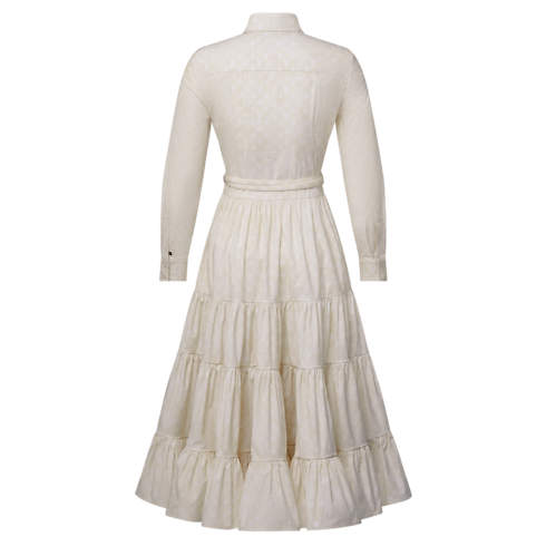 This long-sleeved shirt dress is crafted from a flexible cotton blend in a soft seasonal shade printed with a tonal Monogram motif for a subtle allover signature. A crisp collar and covered button tab emphasize the tailoring codes, while gathered tiers add romantic volume to the full-length skirt and a slim eyelet belt highlights the waistline.