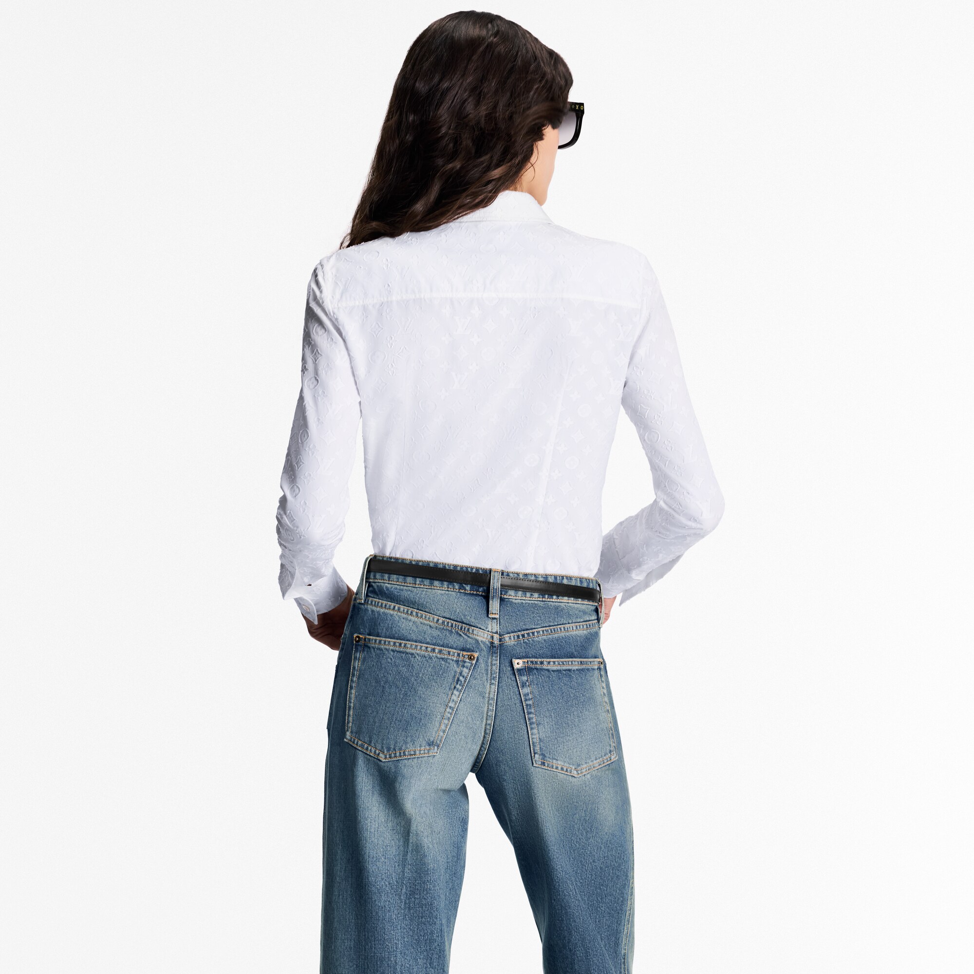 With its iconic shape, this Long Sleeved Fitted Shirt is a key component in the contemporary woman’s wardrobe. Its soft cotton poplin fabric is embellished with an elegant allover Monogram motif in fil coupé. On the sleeve, a Monogram Flower tab adds to the signature effect.