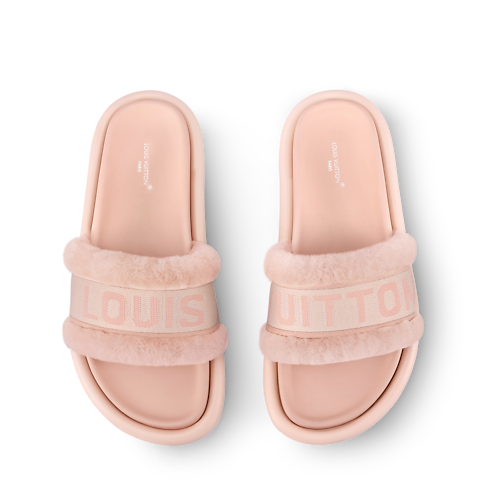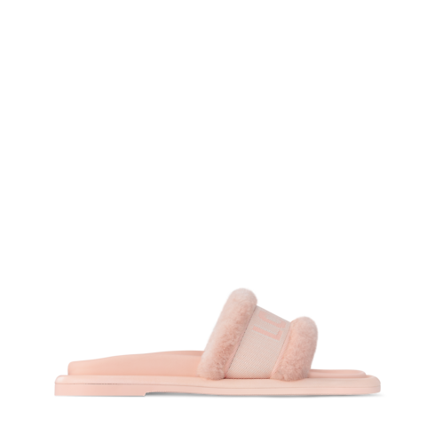 The LV Bliss comfort mule is characterized by its wide front strap in soft shearling, which is embellished with a jacquard ribbon featuring the Louis Vuitton signature. Designed for optimum comfort, this model has a leather-covered, anatomic footbed and a supple rubber outsole surrounded by leather piping.