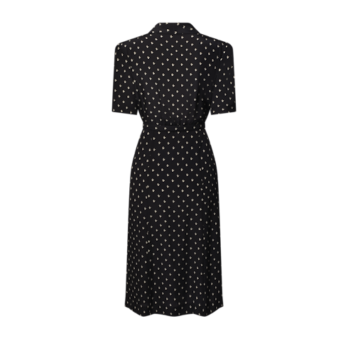 This button-front shirt dress radiates timeless elegance in a chic mid-length shape finished with gathered short sleeves and a crisp notched collar, while a slim belt highlights the waistline. It is cut from silk crepe de chine in a dainty allover print of the LV Initials as reimagined by Grace Coddington as part of this season’s exclusive collaboration.
