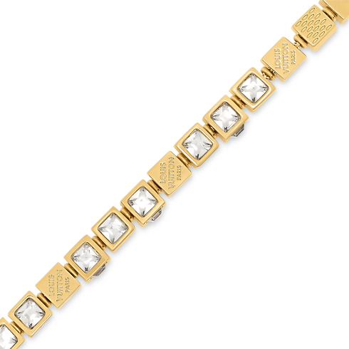 This eye-catching bracelet joins the LV Cube collection, inspired by a puzzle game called Pateki invented by Gaston Vuitton in 1932. Its eye-catching design features gold-toned metal cubes recalling the iconic Damier checkboard pattern, enlivened with sparkling rhinestones and Louis Vuitton Paris signature engraving. A playfully elegant bracelet, and a tribute to the House’s creative heritage.
