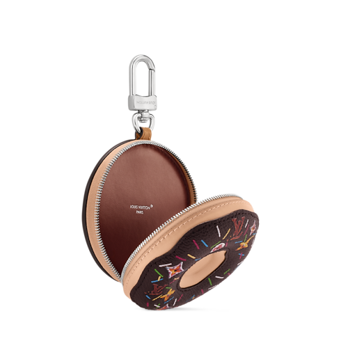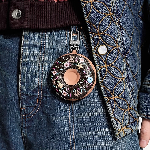 The playful LV Donut is back this season! Reinterpreted in a chocolate color, to link with the transversal animation with small leather goods especially to celebrate Valentine's Day. The leather charm is coated in chocolate icing made from canvas, along with metal rainbow sprinkles, and candy-like Initials and Monogram Flowers. A pair of wireless earphones fits comfortably inside the zip-up pouch.