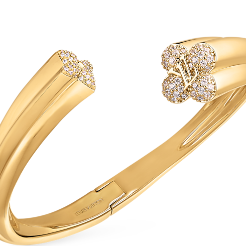 Crafted in gleaming gold-colored metal, the LV Flower Comet cuff bracelet exemplifies the House’s dedication to innovation and fine craftsmanship. Its sculptural geometric design evokes the path of a comet across the night sky, with delicate Monogram Flowers at either end heightened with resplendent rhinestones. A boldly contemporary bracelet infused with avant-garde elegance.