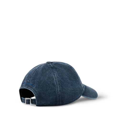 Crafted in a rich navy cotton, the LV Flower Washed cap is a tone-on-tone style with character and ease. An embroidered "LV Flower" signature adorns the faded denim hat, and "LOUIS VUITTON" is discreetly embroidered around the opening of the back, above the adjustable back strap.