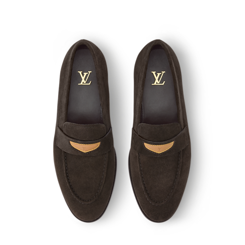 Crafted from suede calf leather, the LV Gent loafer has an exceptionally soft, supple feel, the result of both its fine material and its traditional sacchetto construction. The strap on the upper is embellished with a natural leather insert, which is embossed with the LV Initials and accented with yellow stitching, recalling the House's leather goods.
