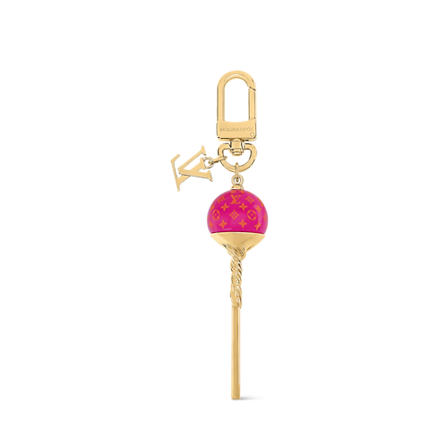 Inspired by nostalgia for childhood pleasures, the LV Sweets bag charm expresses a spirit of youthful joy and imagination. Suspended from a lustrous gold-colored chain, an LV Initials emblem is paired with a colorful lollipop adorned with the iconic Monogram signature. This delightful charm adds a playfully stylish accent to any bag.