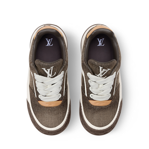 The LV Tilted sneaker is interpreted in 'Coffee Bean' denim, developed for the ready-to-wear collection. An elevated take on denim, the fabric is not dyed, but instead woven to create a faded, worn-in effect. It enhances the vintage feel of this sneaker, which was inspired by the early 2000s, and features natural leather trim and tilted LV Initials signatures.