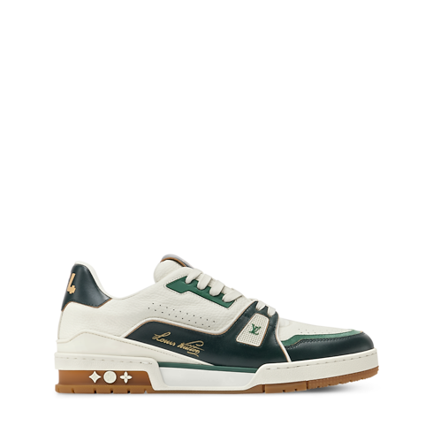 This refined interpretation of the LV Trainer sneaker combines grained and aged calf leather, fusing vintage-style materials with a contemporary design. This iconic model, which was inspired by classic basketball sneakers, is notable for its elaborately constructed upper, which features multiple House signatures, and its technical rubber outsole with Monogram Flowers.