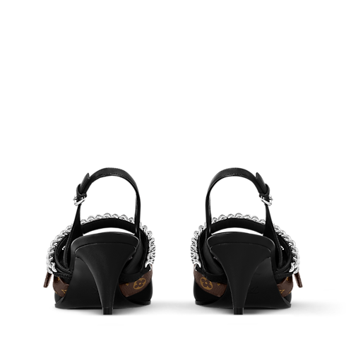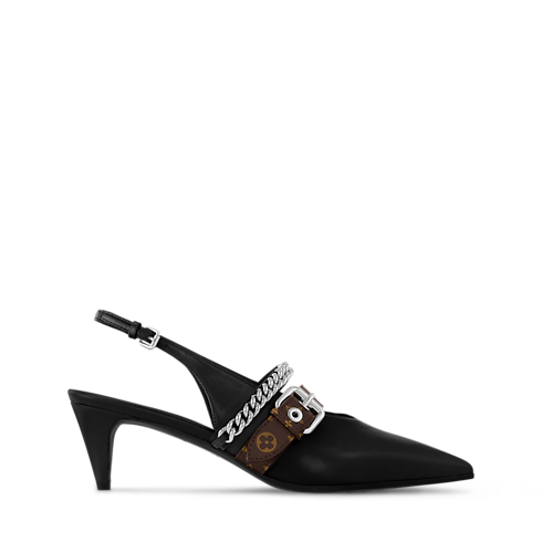 The LV Vibe slingback pump is a striking model crafted from supple lambskin. It is distinguished by its sleek pointed toe, leather-covered heel and rich detailing, including a decorative, belt-like strap in Monogram canvas and a chunky, silver-toned chain. The back strap is adjusted with a small, rectangular buckle.
