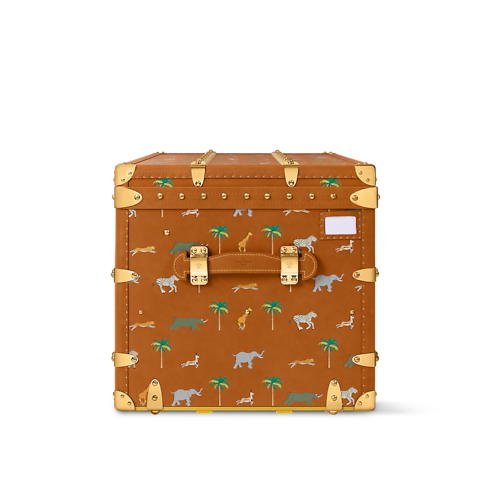 Inspired by the film, LV x The Darjeeling Limited Courrier Lozine 90 is crafted from elegant tan leather with a vintage allure. Colorful illustrations of animals and palm trees create a preppy yet naïve aesthetic, echoing the movie’s captivating, nostalgic universe. The trunk is numbered "11" to echo the movie.