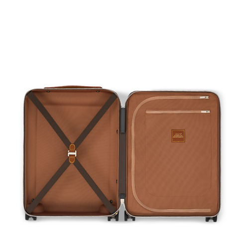 The Horizon 55 rolling suitcase is made from Damier Ebene Heritage canvas, featuring illustrations of wild animals from the savannah as part of the LV x The Darjeeling Limited collection. Brown leather trim on the reinforced corners and cane handle accentuates the darker palette. Its cabin-size format offers an unexpectedly spacious interior.