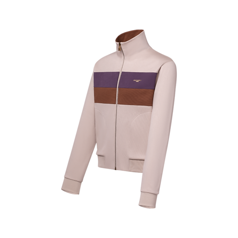 A refined take on a casual silhouette, this elegant beige track top is crafted in double-face cotton jersey accented with contrasting bands across the torso and discreet gold-stamped Louis Vuitton Paris lettering on the chest. This season’s graphic Louis Vuitton x The Darjeeling Limited motif adorns the inside, while a leather signature patch completes the back.