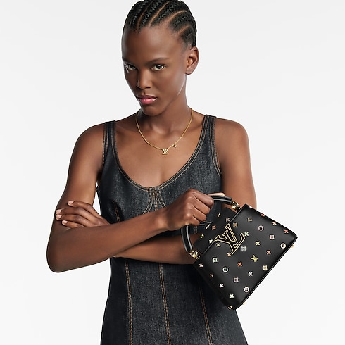 Part of the Takashi Murakami collaboration, this elegant Capucines Mini is designed to honor the 130th anniversary of the Louis Vuitton Monogram. It is crafted from cowhide, embellished with multicolor LV Flower studs and LV Initials to create a couture-inspired finish. The double-carry style makes an elegant choice for evening, and can be worn multiple ways.