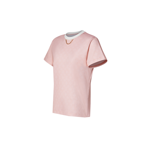 This T-shirt has a fresh, modern feel in cotton jersey which is subtly signed all over with a delicate Mahina Monogram motif in elegant seasonal tones. The contrasting crew neckline introduces a graphic, sporty accent, while a chic LV chain embellishment completes the look with a final House touch.