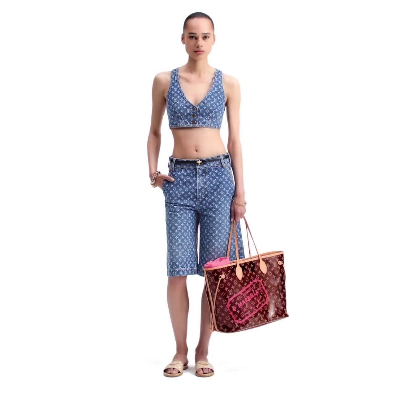 These Bermuda shorts are reimagined with a graphic allover Monogram motif for a chic signature look. They have a casual, structured feel in denim and finished with contrasting yellow topstitching, while carpenter loops introduce an understated utility detail to the back pockets and a leather Louis Vuitton Paris patch adds a final House touch to the waistband.