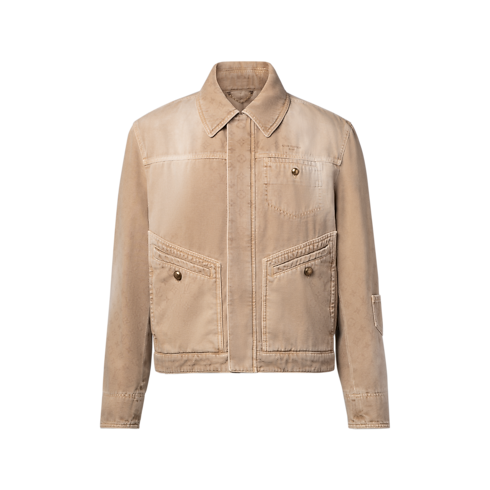 This camel-colored denim workwear jacket from the Spring-Summer 2026 show has a gently weathered look inspired by India’s natural textile dyeing traditions. It features a Faded Monogram motif printed onto the cotton canvas, while a discreet tone-on-tone embroidered signature adorns the chest. Aged gold-toned buttons add a chic finishing touch. Pair with matching pants for a total look.