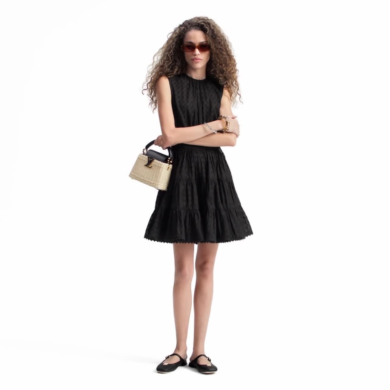 This quintessential little black dress is crafted from an airy cotton-silk blend that is discreetly signed allover with the Monogram motif in fil coupé, while a Monogram Flower trim highlights the hem. The fitted top is offset by the volume of the A-line skirt, which is emphasized with gathered tiers. An exposed golden zipper fastens the back.