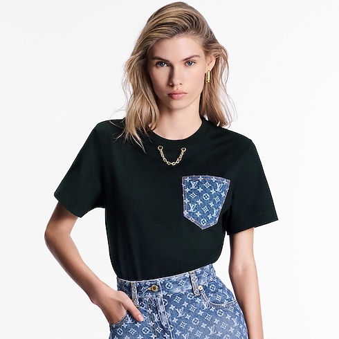 This timeless T-shirt is reworked with casual signatures for elevated everyday styling. It is cut from soft cotton jersey in a subtly tapered shape. The crew neckline is embellished with a chic LV chain detail, while the chest pocket strikes a contrast in washed Monogram denim accented with yellow topstitching.
