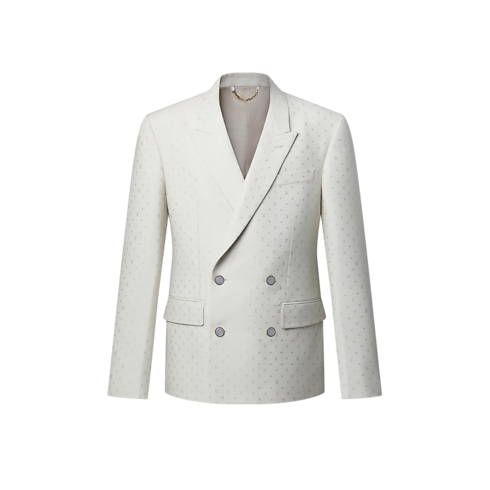 This chic double-breasted evening jacket in a pale ivory hue stands out from the crowd for summery celebrations. It has a tone-on-tone jacquard Spaced Mini Monogram motif expressed in a subtle play of matte and lustrous textures thanks to the fabric's luxurious silk and mohair content. The sleek silhouette—an icon of dandy wardrobe style—makes a sharp suit with matching pants.