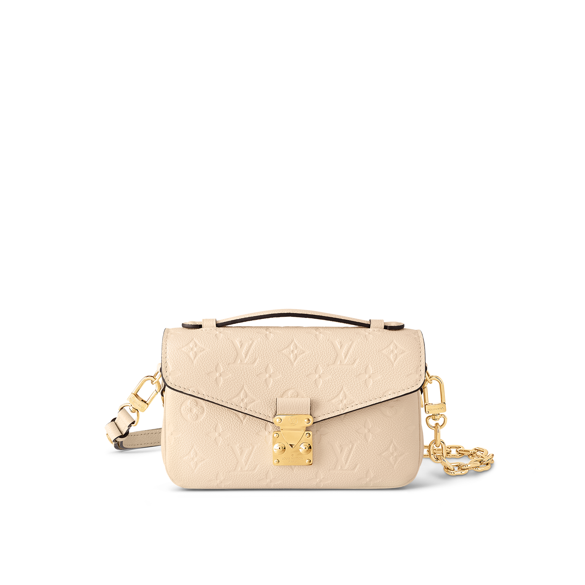 Made from embossed Monogram Empreinte leather, the Pochette Métis handbag blends signature House style and contemporary detailing. The on-trend East-West silhouette is highlighted by a heritage S-lock and removable short chain, both cast from gold-finish metal. With its well-organized interior and adjustable smart strap, this compact bag adapts perfectly to active lifestyles.