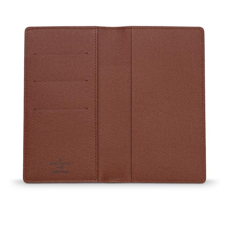 - Monogram canvas, cross grain leather lining - Three credit card slots, one long compartment on one side, a long slot on the other to hold an agenda refill - Agenda refills and address book available separately